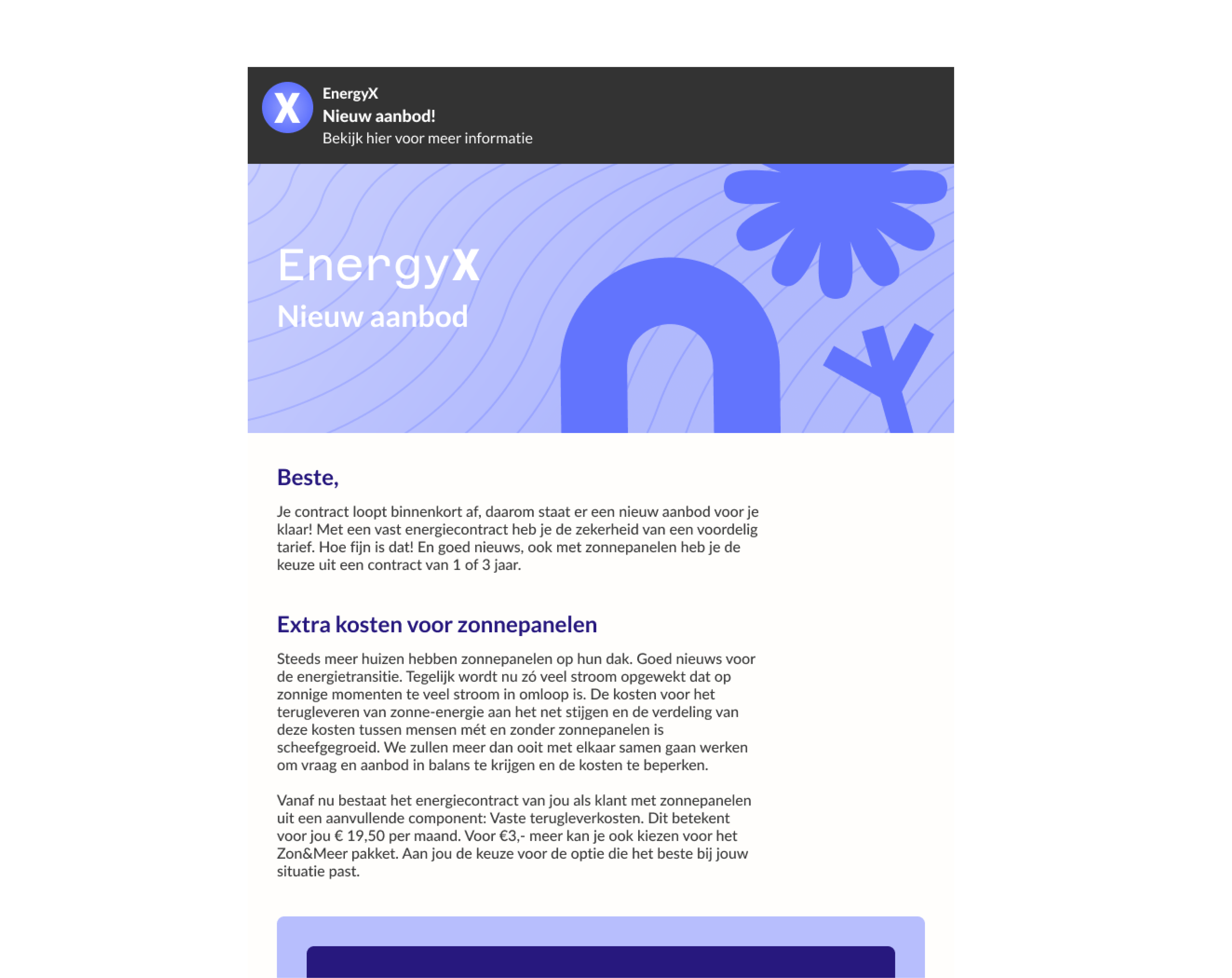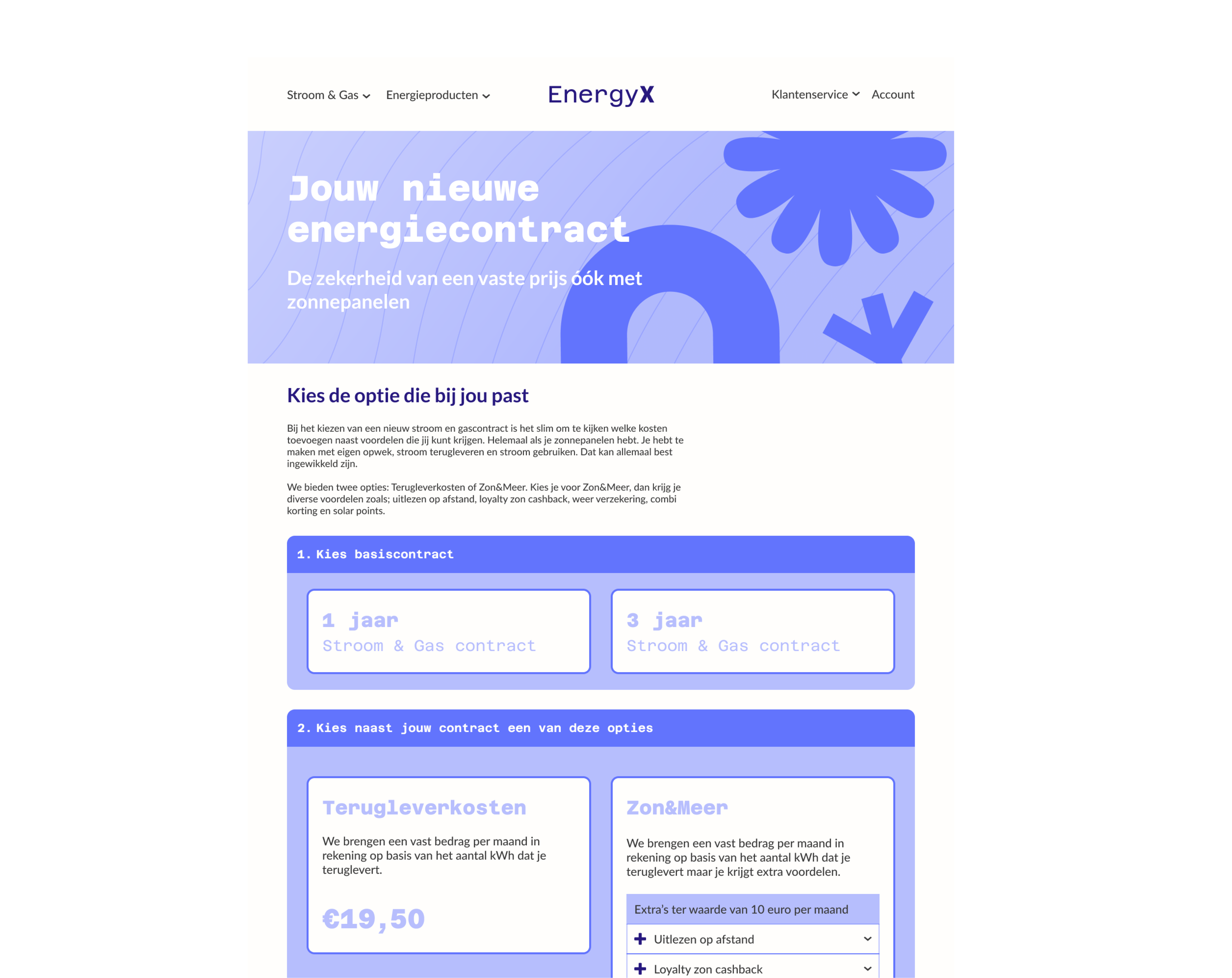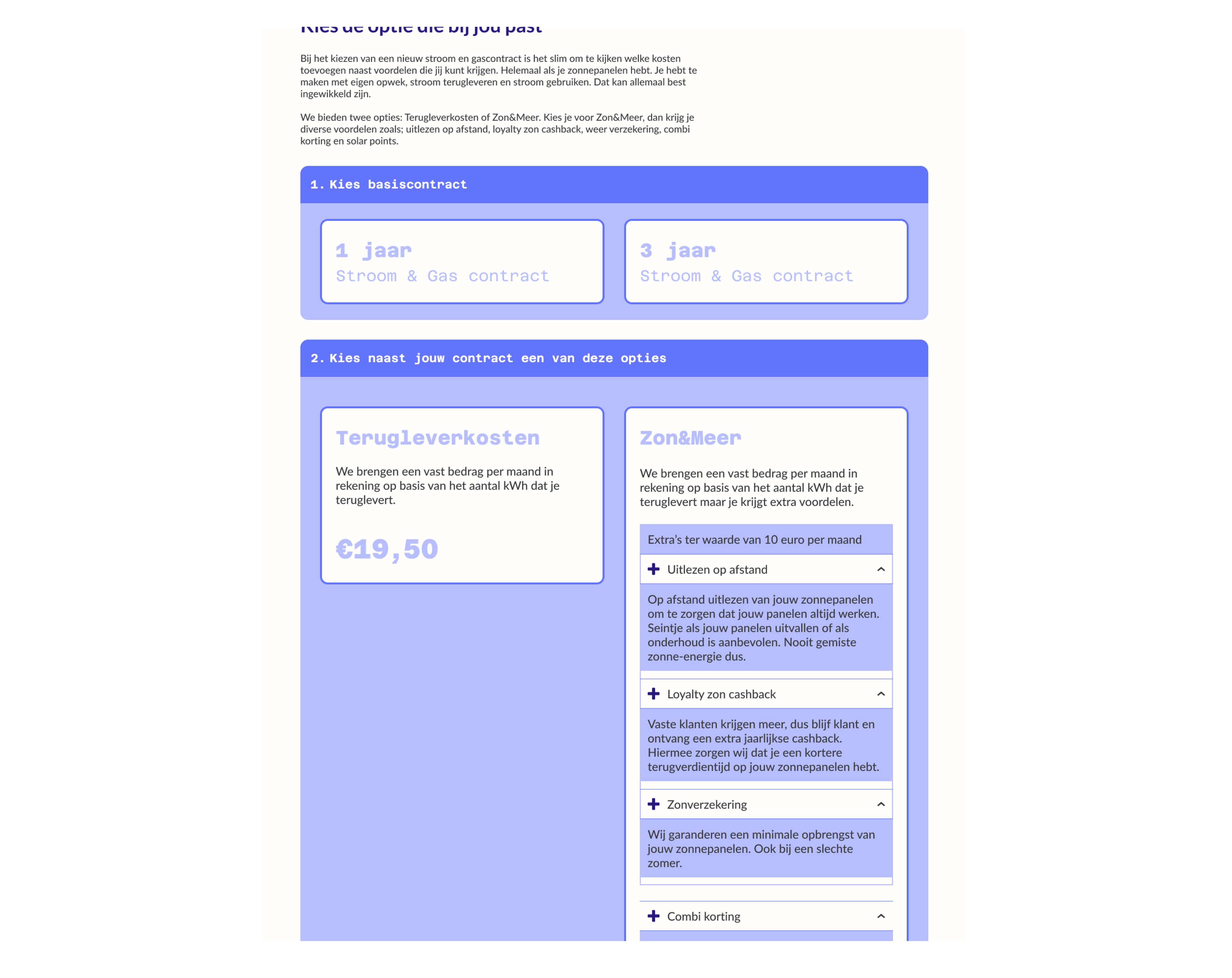 The biggest challenge was that the design of the prototype did not resemble that of Essent. This was a new idea, and we wanted to avoid revealing it to our competitors. So, I needed to create a whole new brand identity in 30 minutes, which the AI web generator of Framer helped with. I described the company, the type of page, and the kind of colors, and the generator did the rest. It was great to show what I had in mind to others quickly. Based on that agreement, I created a newsletter and a page where people could select the type of contract.