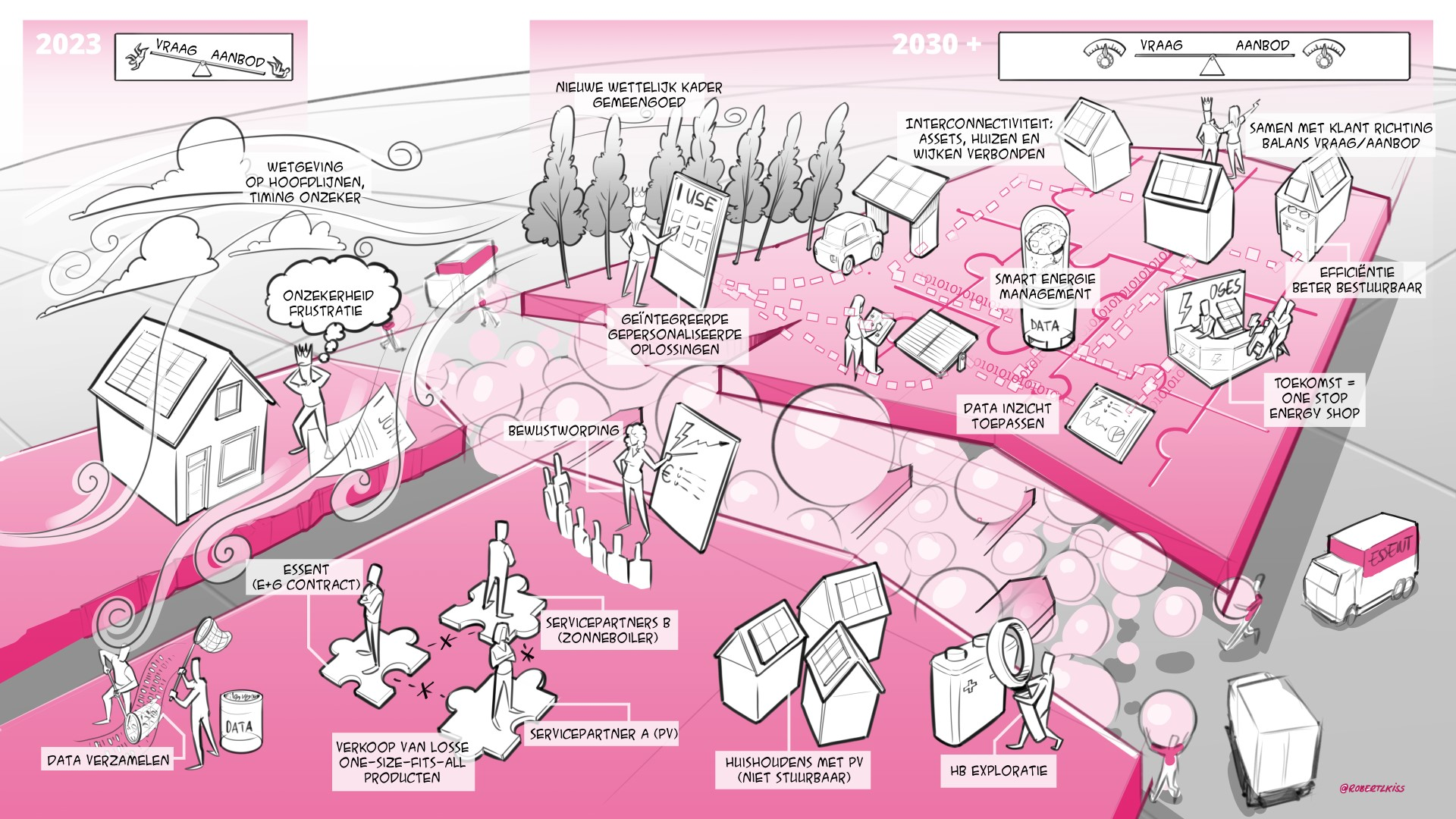 On the second day of the strategy sprint, we mainly iterated on the trends and discussed these with stakeholders. The group incorporated these conversations into a vision drawing and a more detailed visualization. Based on this vision, we were able to create 'How Might We's?' that we could use in the design sprint.