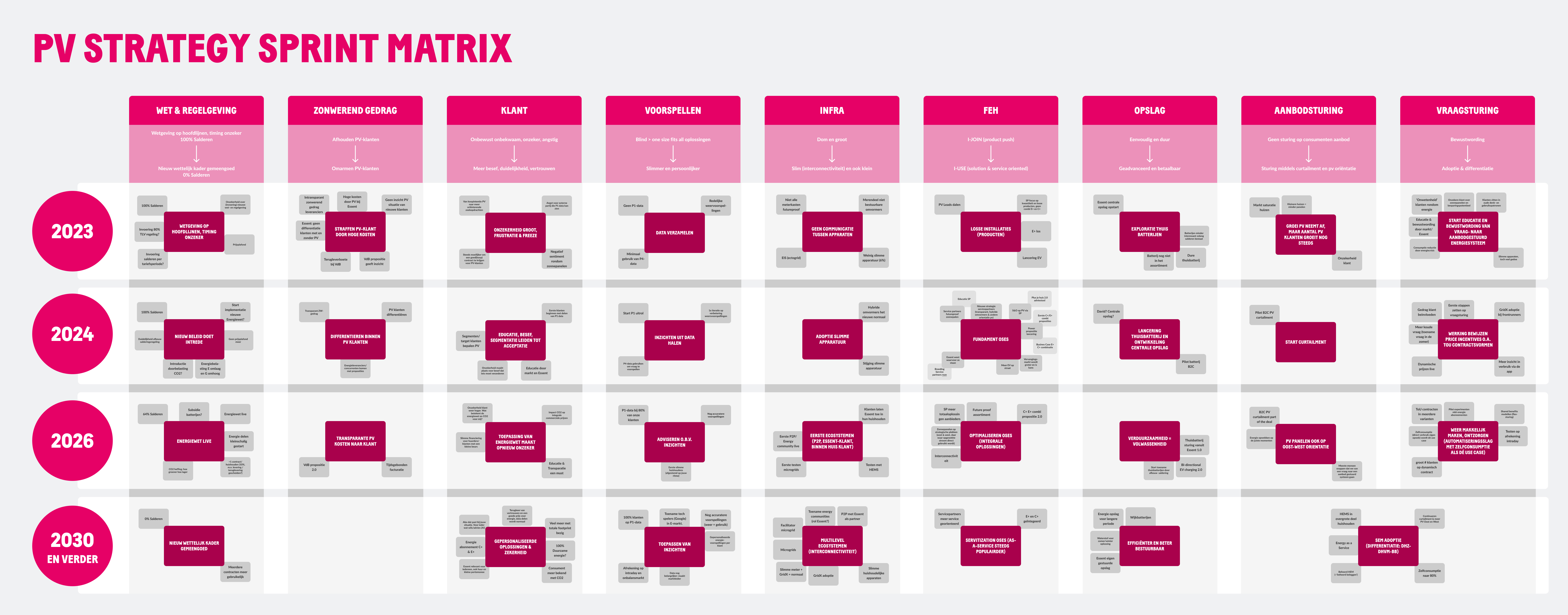 I was part of a two-day strategy sprint where we created an overview of trends that were happening right now, next year, in four years, and in 2030. Every year, things happen, and the group had a task to write this down. After everything was written down, we clustered those stickies. These groups remained the same over the years, so this way, you can see how something changes over time.