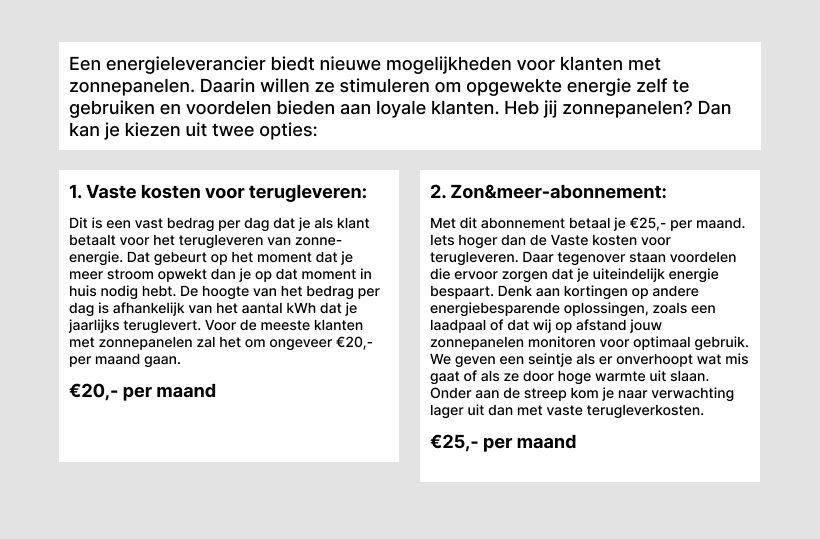 We wanted to test this idea as fast as possible. So, after documenting all the assumptions we had, I created a Lyssna test where we tested the propositions as simply as possible, only in written text. At that moment, you focus on the content instead of the appearance. After the tester read the new context, they had two options. If you had to take out a new energy contract and only had these two options, which one would you take? After selecting the option, we had follow-up questions to understand the decision better.
